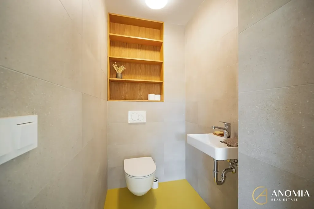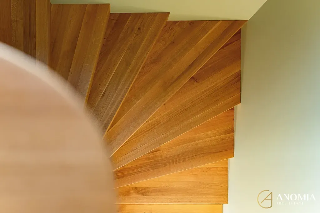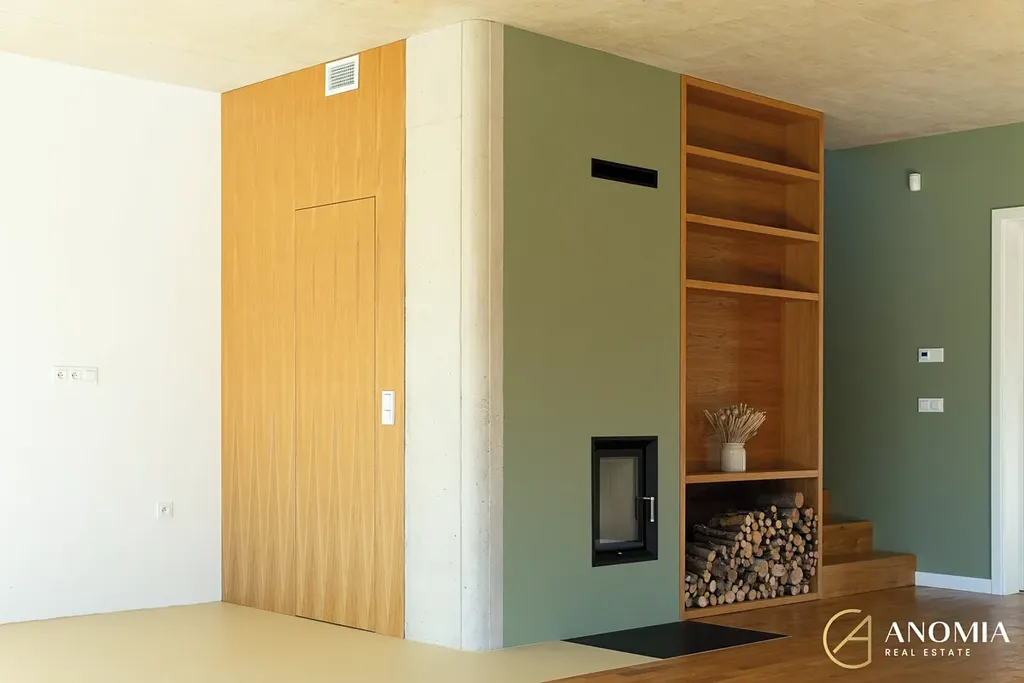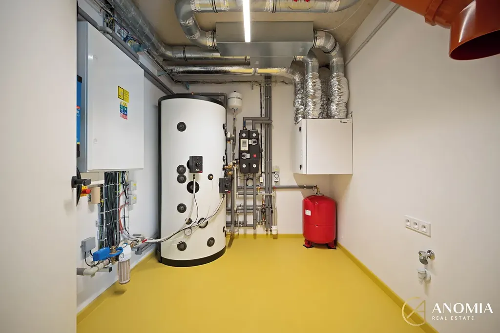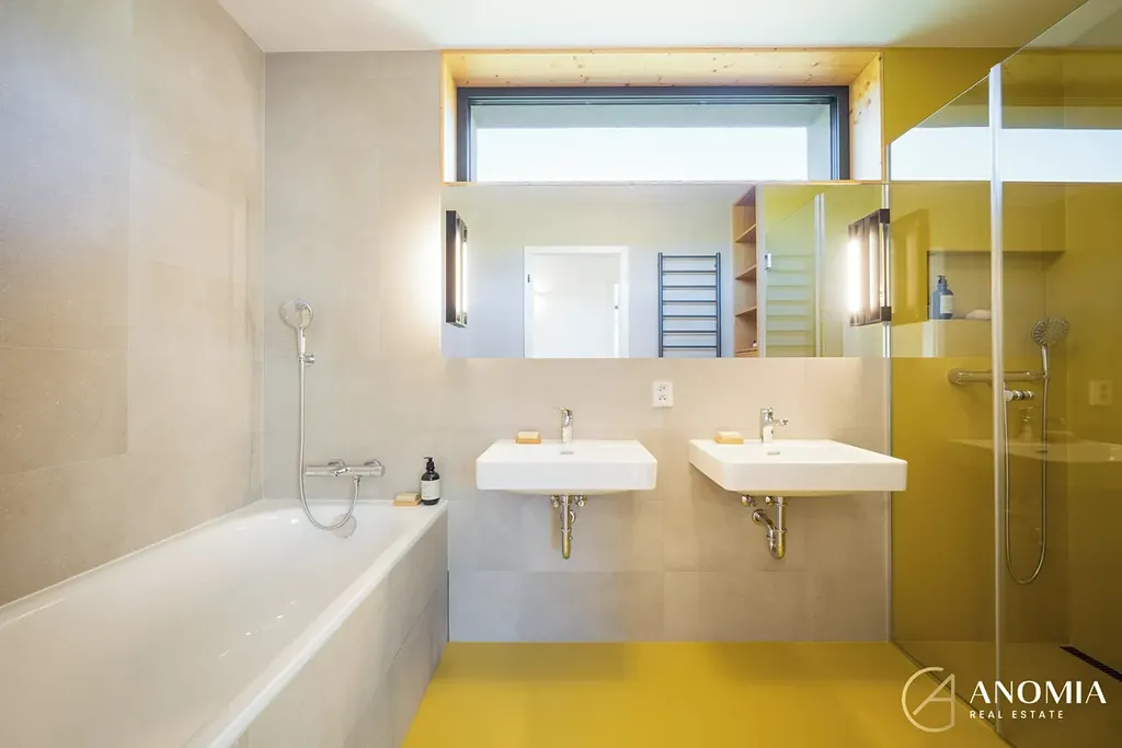 Vápenopískové zdivo, monolitické stropy, zateplení EPS 24 cm, ve střeše cca 45 cm foukané izolace, AL okna s trojskly, venkovní žaluzie s čidly (léto/zima), masivní dřevěné podlahy, polyuretanové stěrky, italská dlažba. PENB A (–40).