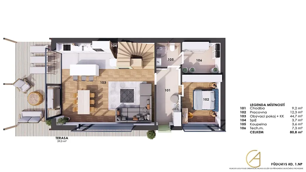 Přízemí: obývací prostor s přípravou na kuchyň s ostrůvkem a spíží, pracovna/hostinský pokoj s vlastní koupelnou, technická místnost, vstup, WC.