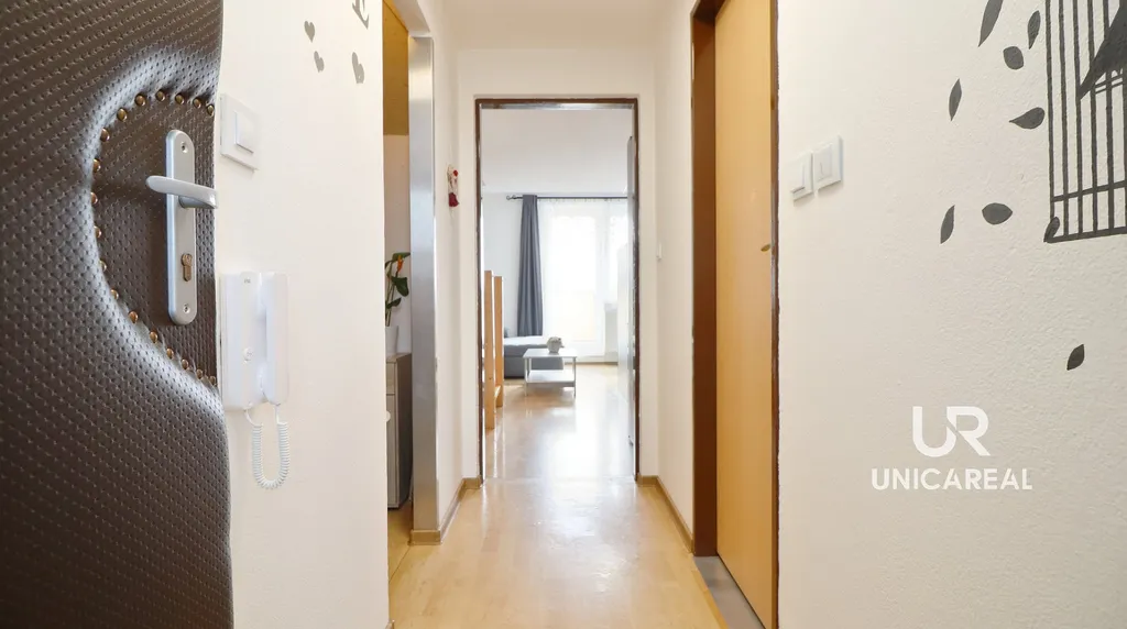 Ze vstupní chodby je vpravo ložnice, vlevo moderní kuchyňský kout propojený s prostorným obývacím pokojem. Odtud je vstup na prosluněnou lodžii s krásným výhledem do okolí.