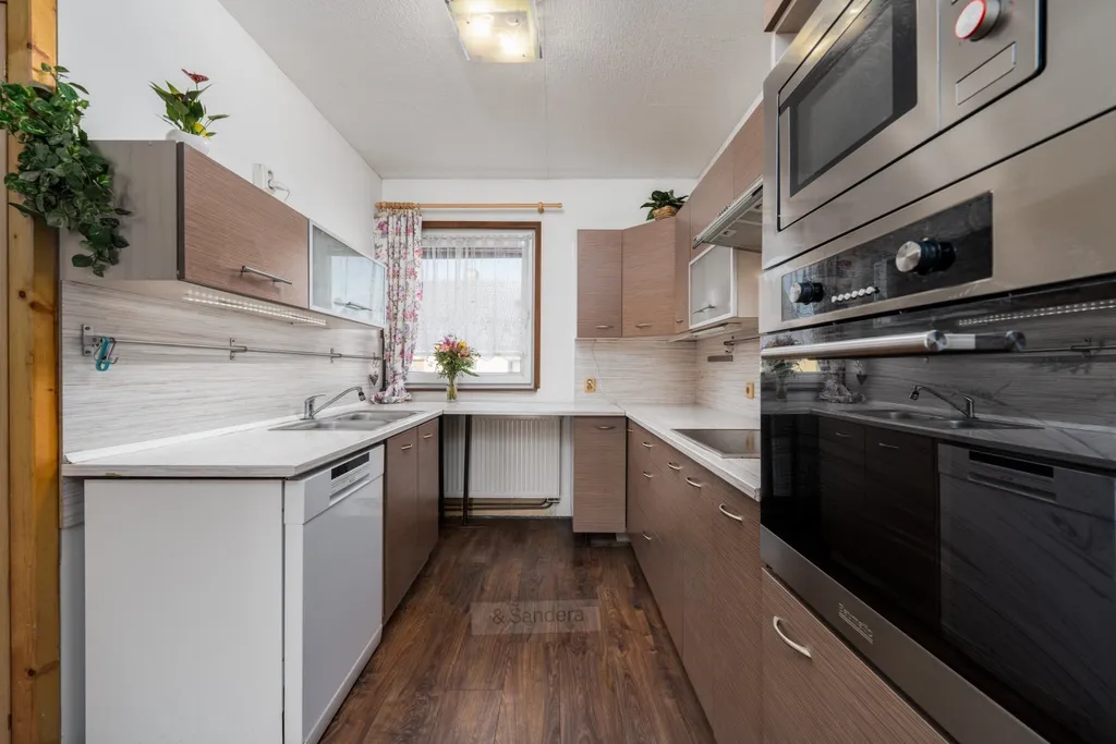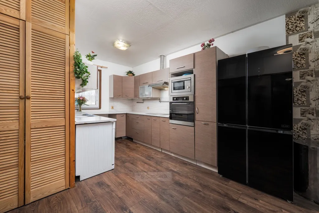 Druhé nadzemní podlaží nabízí komfortní a velmi prostorný byt o dispozici 4+kk s celkovou výměrou přibližně 114 m². Dispozice odpovídá moderním nárokům na bydlení – dominantou je velkorysý obývací pokoj propojený s kuchyní do tvaru U, která je vybavena vestavěnými spotřebiči. Dále se na tomto podlaží nacházejí tři samostatné pokoje, ložnice a koupelna s vanou. Příjemným benefitem je také balkon táhnoucí se po celé délce domu, který nabízí další venkovní prostor a příjemné posezení.