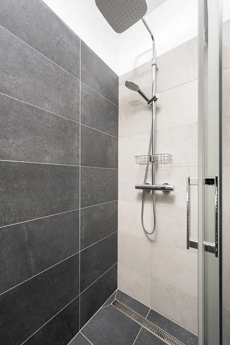 Koupelna s toaletou je prostorná s velkým sprchovým koutem. Je zde také umístěna pračka se sušičkou.