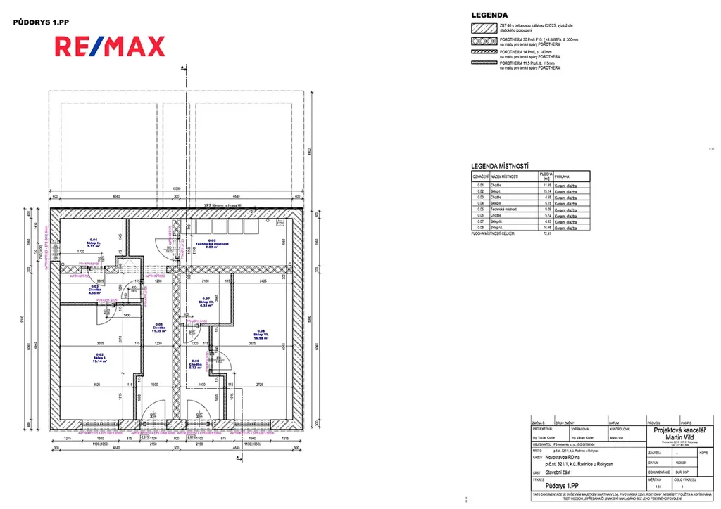 V 1.PP je prostorný sklep s denním světlem, který lze využít i jako pracovnu či fitness. Součástí 1.PP je i technické zázemí. K domu patří zahrada a o celkové výměře 478 m2. Vytápění je řešeno teplovodním podlahovým topením napojeným na tepelné čerpadlo NIBE, součástí je zásobník TUV. Na střeše budou instalovány fotovoltaické panely o výkonu 30 kWp, což zajišťuje velmi úsporný provoz domu. Dům spadá do energetické třídy A, což ho řadí mezi budovy s minimální náročností energie. Stavba je navržena jako zděná z keramických cihel POROTHERM (obvodové zdivo 300 mm, příčky 115 mm). Krov je z dřevěných vazníků, pultová střecha s plechovou falcovanou krytinou. Osazena budou plastová okna s trojskly, v exteriéru v barvě antracit, v interiéru bílá, doplněná o venkovní žaluzie. Vstupní dveře budou ve stejném barevném provedení. Podlahy obytných místností vinylové, v koupelně, na WC a v technické místnosti keramické dlažby. Pozemek bude oplocen pletivem a budou provedeny terénní úpravy. Zpevněné plochy budou ze zámkové a terasové dlažby.