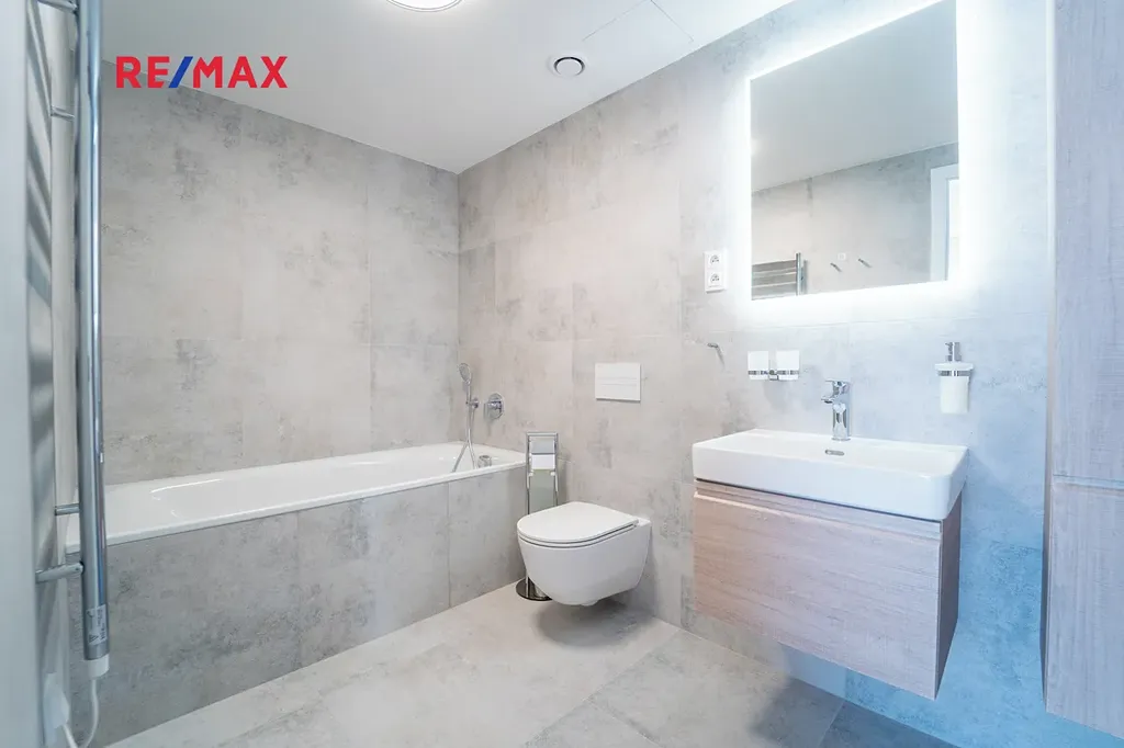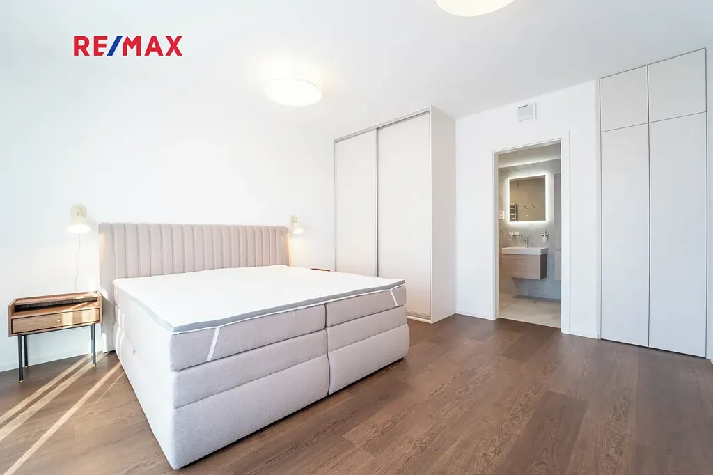 Byt je nabízen ve vysokém standardu, je zde velké množství úložného prostoru díky vestavěným skříním v předsíni a v ložnici. Do velké koupelny s vanou a toaletou se vchází přímo z ložnice, druhá toaleta má vstup z předsíně a je zde umístěna pračka a sušička.