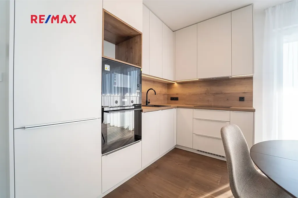 Kuchyňská linka je vybavena veškerými vestavnými spotřebiči a díky vysokým horním skříňkám také nabízí dostatek úložného prostoru.