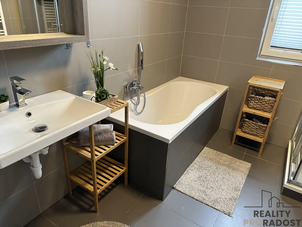 jídelní stůl se čtyřmi židlemi, pohodlná pohovka značky Polstrin, konferenční stolky a další nábytek ve sladěném designu, ložnice s vestavěnou skříní a postelí, dětský pokoj se skříní a rozkládací postelí, koupelna s vanou i sprchovým koutem, pračka a sušička značky Siemens, samostatné WC s umyvadlem, prostorná vstupní chodba s botníkem, podlahové vytápění v celém bytě a chytré osvětlení ovladatelné přes mobilní zařízení.