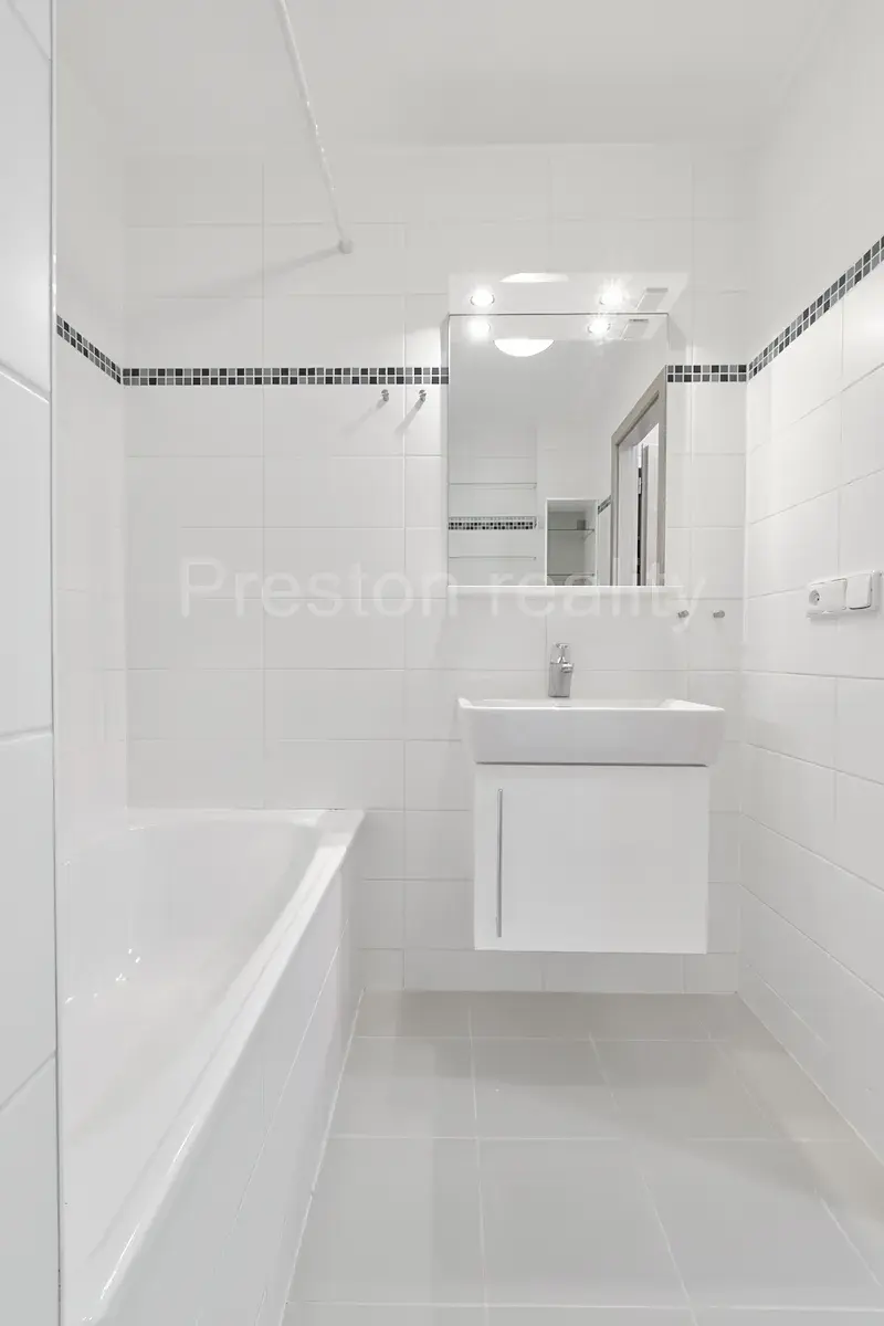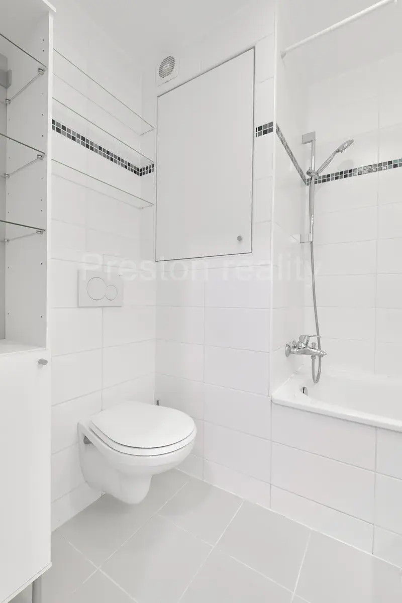 Koupelna je vybavena vanou, WC, umývadlem se skříňkou a s dalšími úložnými prostory (stojací a vestavná skříňka). K dispozici je vysokorychlostní internet od společnosti Vodafone (již připravený modem s wifi), v případě zájmu převedeme na nájemce. Topení ústřední, dálkové.
