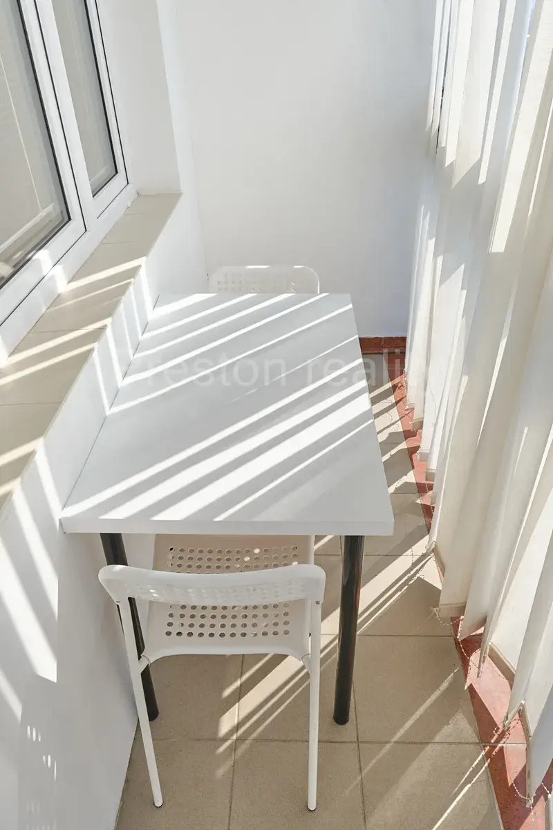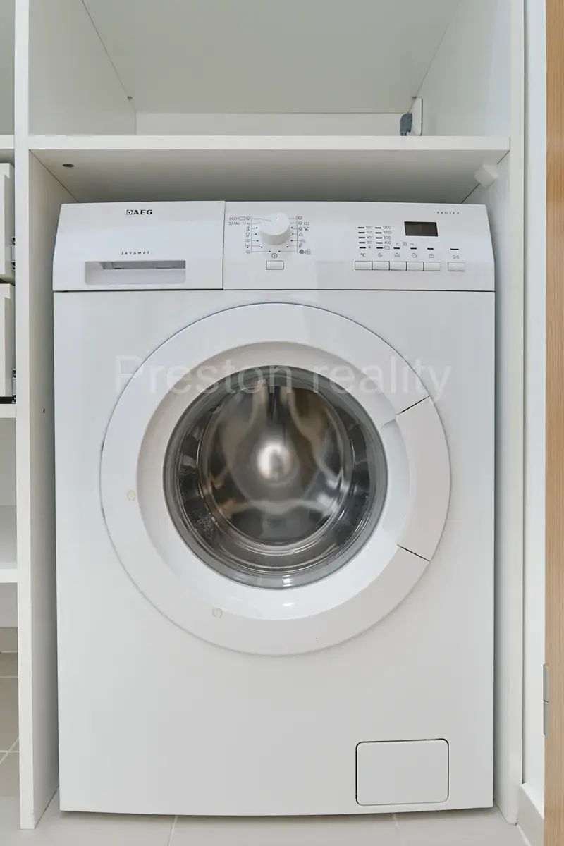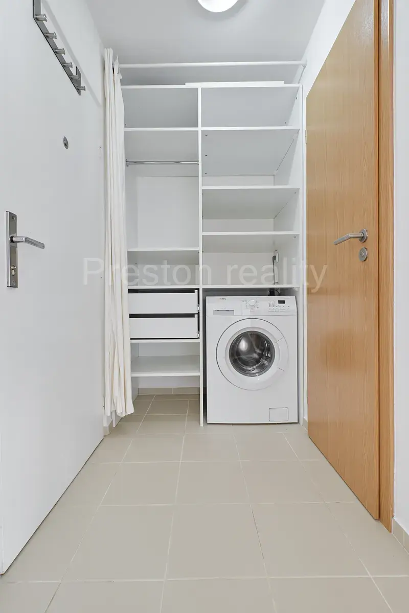V obývacím pokoji se západní orientací (17 m2) je šatní skříň se zrcadly, z obývacího pokoje lze vstoupit do kuchyně a na lodžii. V kuchyni se nachází linka s dvouplotýnkovou sklokeramickou deskou, mikrovlnkou a zabudovanou lednicí v dolní části kuch. linky. V předsíni je další úložný prostor: skříň s policemi, zásuvkami a zabudovanou pračkou AEG. V předsíni, kuchyňském koutu a koupelně je na zemi položená dlažba, v obývacím pokoji plovoucí podlaha (vzoru dub). Dveře značky Sapeli, okna plastová, lodžie je zasklená po celé své šířce.