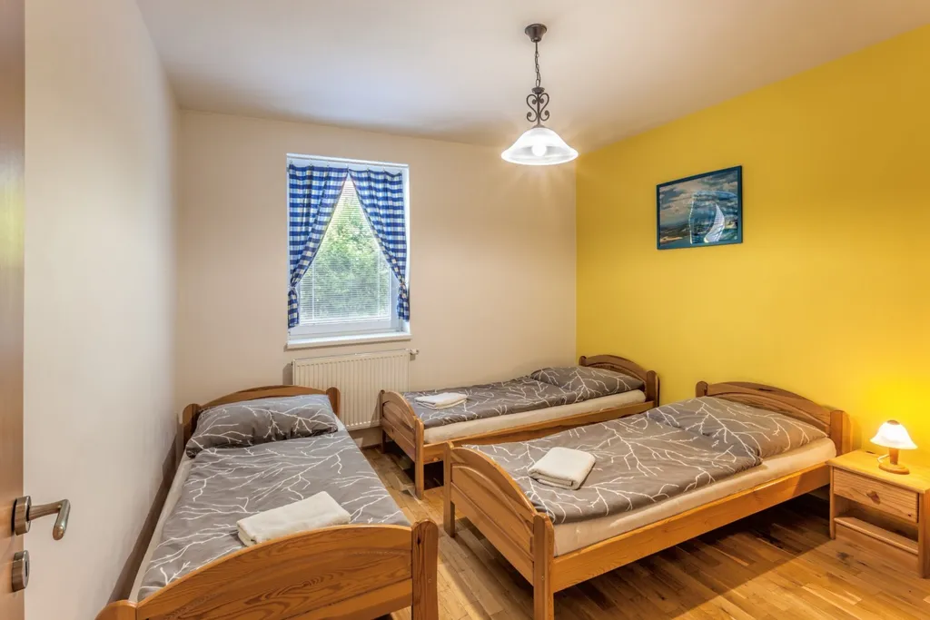Rodinný dům: předsíň, toaleta, chodba, tři neprůchozí pokoje, koupelna (s rohovou vanou, sprchovým koutem i WC), prostorný obývací pokoj s jídelnou, kuchyň a terasa.