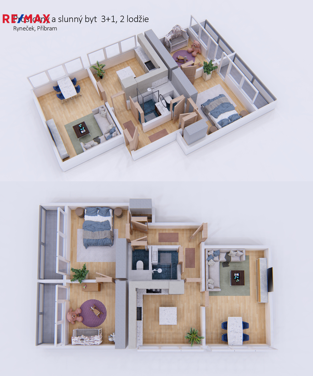 Dispozice bytu je velmi praktická a nabízí prostorný obývací pokoj s jídelní částí, samostatnou kuchyň, dvě ložnice, koupelnu se sprchovým koutem a samostatné WC. Velkým benefitem jsou dvě lodžie, které poskytují příjemný prostor pro relaxaci a zároveň přivádějí do bytu dostatek denního světla.