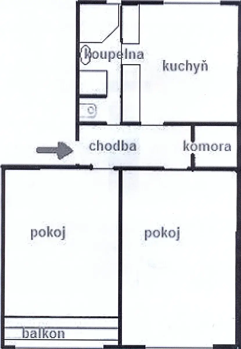 Dva samostatné pokoje (jeden s balkonem), jídelna s kuchyňskou linkou, koupelna (rohová vana, sprchový kout), WC, předsíň, komora.