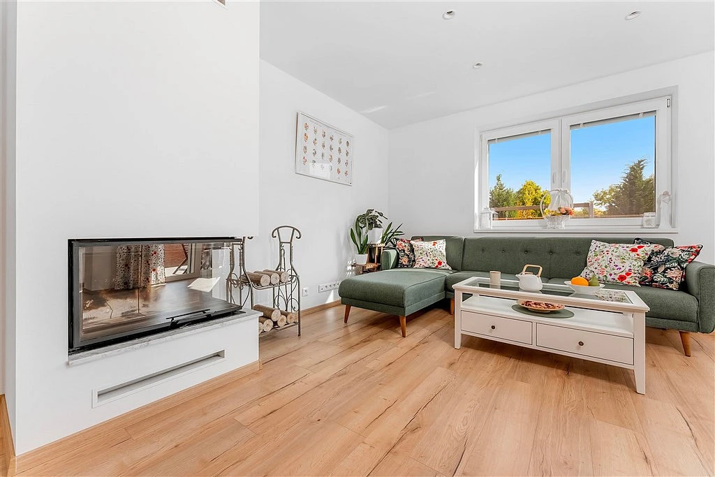 ___ Hlavní prostor domu tvoří obývací pokoj (26 m²) s přiléhající otevřenou kuchyní (10 m²). V kuchyni nová kuchyňská linka se všemi spotřebiči. Prostorný obývák zdobí stylový výkonný krb, přičemž teplo, které vytváří, je průduchy rozváděno do obou podlaží. Za portálovými balkónovými dveřmi navazuje na obývák jeho letní část, tj. zastřešená terasa s jídelním stolem, případně i s grilem, která tak zvětšuje obytný prostor domu o další metry.