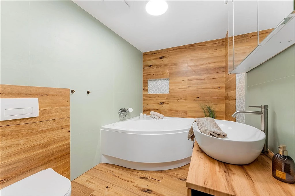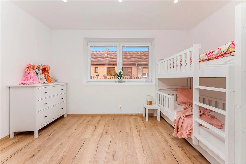 ___ Po masivních dřevěných schodech vyjdete do podkrovní haly, která nabízí vstup do čtyř pokojů a do koupelny s mohutnou rohovou vanou a WC. Tři pokoje jsou ve standardní velikosti kolem 12 m² a jeden má na podkroví úctyhodných 17 m². Ze dvou pokojů se dá vyjít prosklenými dveřmi na rozměrnou terasu (18,3 m²), s výhledem mj. i na Svatý kopeček.