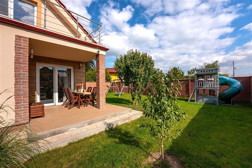 ___ Nevelká, ale útulná zahrada kolem domu nabízí dostatečný prostor pro rodinou relaxaci a zábavu. A cihlový polovysoký plot kolem dokola zaručuje dostatek soukromí. Předzahrádka do ulice je chráněna zdobným kovovým plotem a bránou, která v případě potřeby umožní vjezd a parkování 1 až 2 vozidel na zahradě, s přípravou na nabíjení elektrovozidla.