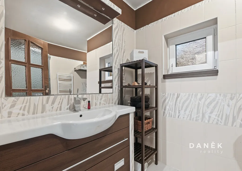 Součástí patra je druhá koupelna doplněná technickým zázemím s přípravou pro pračku, sušičku a další domácí vybavení, díky čemuž je prostor plně funkční i pro vícečlennou domácnost. Koupelna je vybavena podlahovým vytápěním, které zvyšuje komfort každodenního užívání a podtrhuje praktický charakter tohoto podlaží.