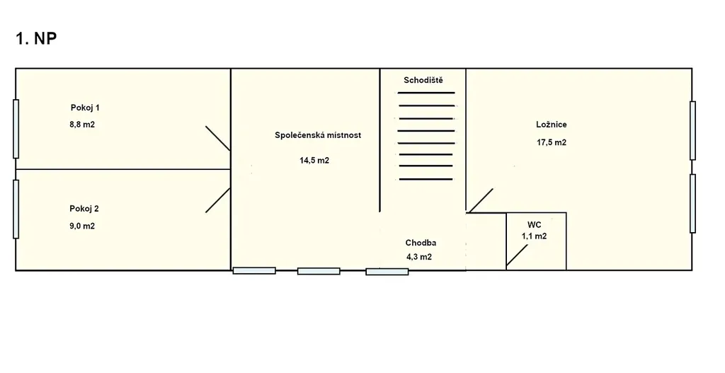 V přízemí se nachází obývací pokoj spojený s kuchyňským koutem, koupelna, WC a technická místnost. V 1. patře je společenská místnost, ložnice, 2 menší dětské pokoje a toaleta. K domu přiléhá zděný přístavek, sloužící jako dílna a kolovna. Pod přístavkem najdeme malý sklípek o velikosti cca 6 m2.