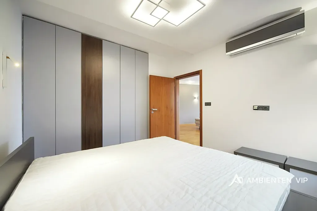 Prostorný byt o podlahové ploše 93,2 m2 s balkónem o velikosti 7,6m2 se nachází ve 5. patře moderní budovy s výtahem. Byt disponuje ložnicí a pokojem, dále prostorným kuchyňským koutem s obývacím prostorem o velikosti 44 m2, z kterého je přímý vstup na balkón s pěkným výhledem do zeleně a zahrady. Všechny pokoje jsou vybaveny nábytkem. Nájemník se tak může nastěhovat pouze s osobními věcmi a může ihned bydlet.