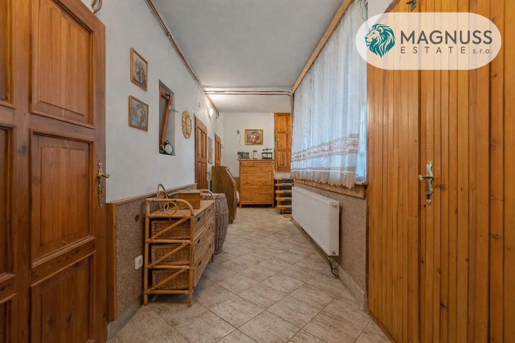 Dispozice domu je 4+1 s podlahovou plochou přibližně 160 m². Vstup do nemovitosti vede přes příjemnou terasu s krbem, která je ideálním místem pro posezení s rodinou či přáteli. Terasa se nachází vedle stodoly a navazuje na vstupní halu, kde je k dispozici koupelna, samostatné WC a dvě praktické místnosti využívané jako úložné prostory.