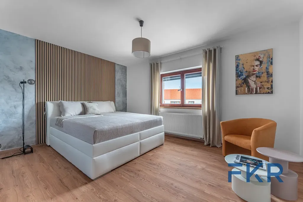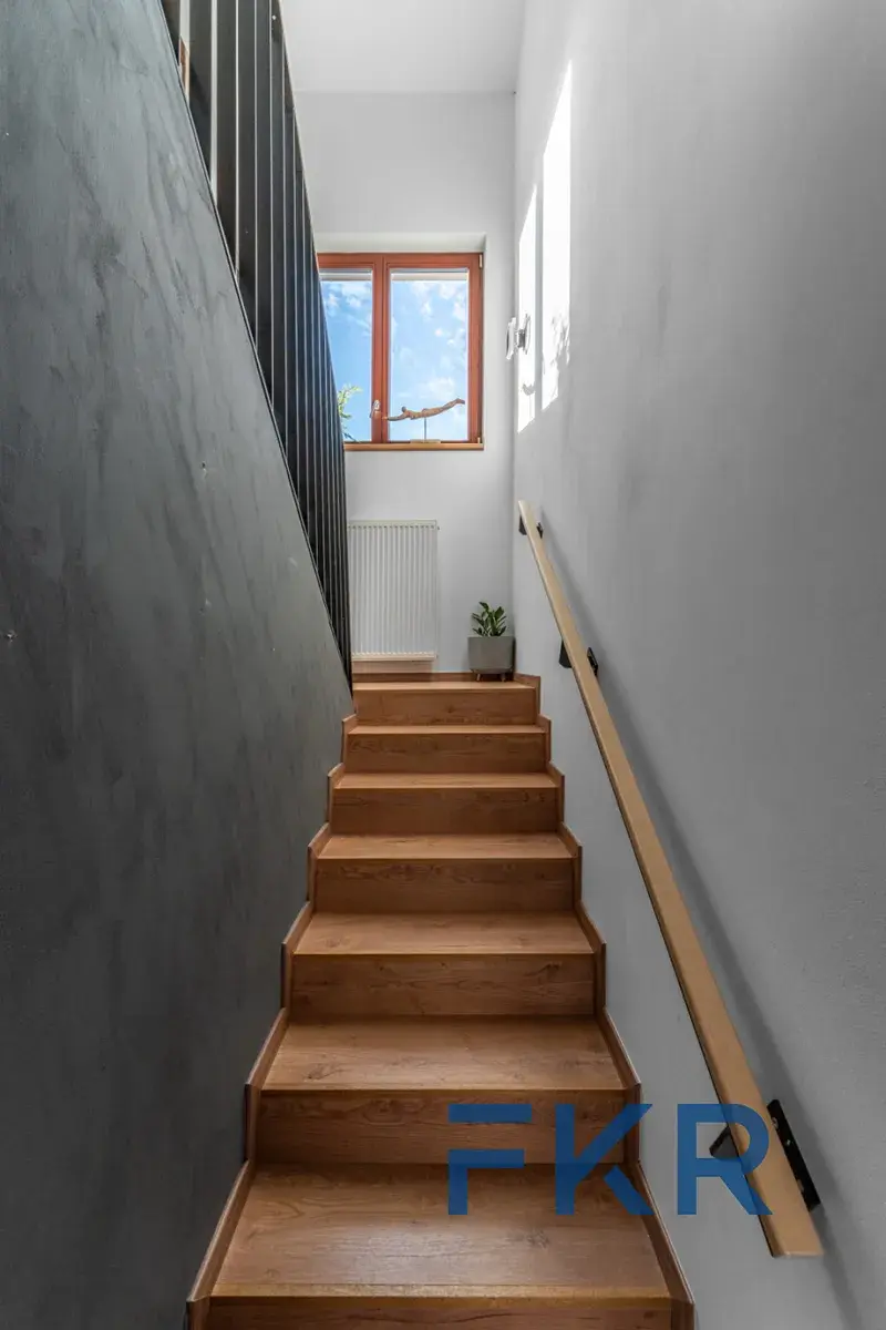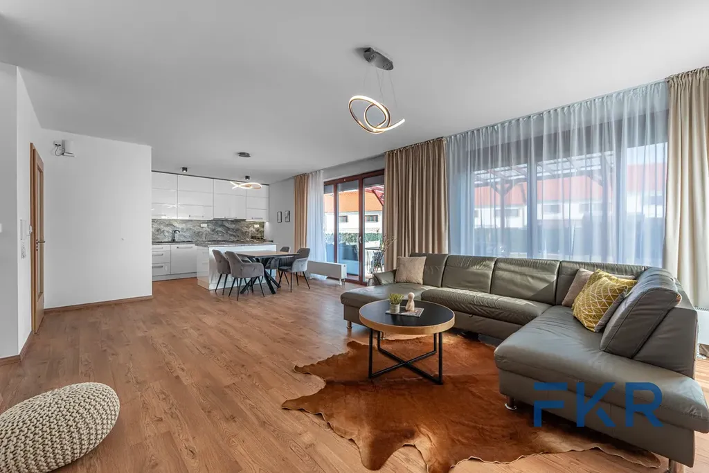 Dominantou obytného prostoru je velkorysá kuchyně s ostrůvkem a jídelním stolem. Interiér pracuje s moderními prvky a vyváženou paletou barev, kterou doplňuje dřevěný dekor podlah a citlivě sladěné provedení koupelen.
