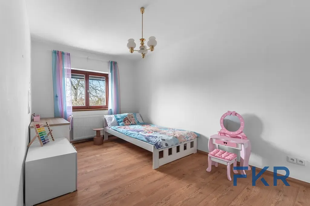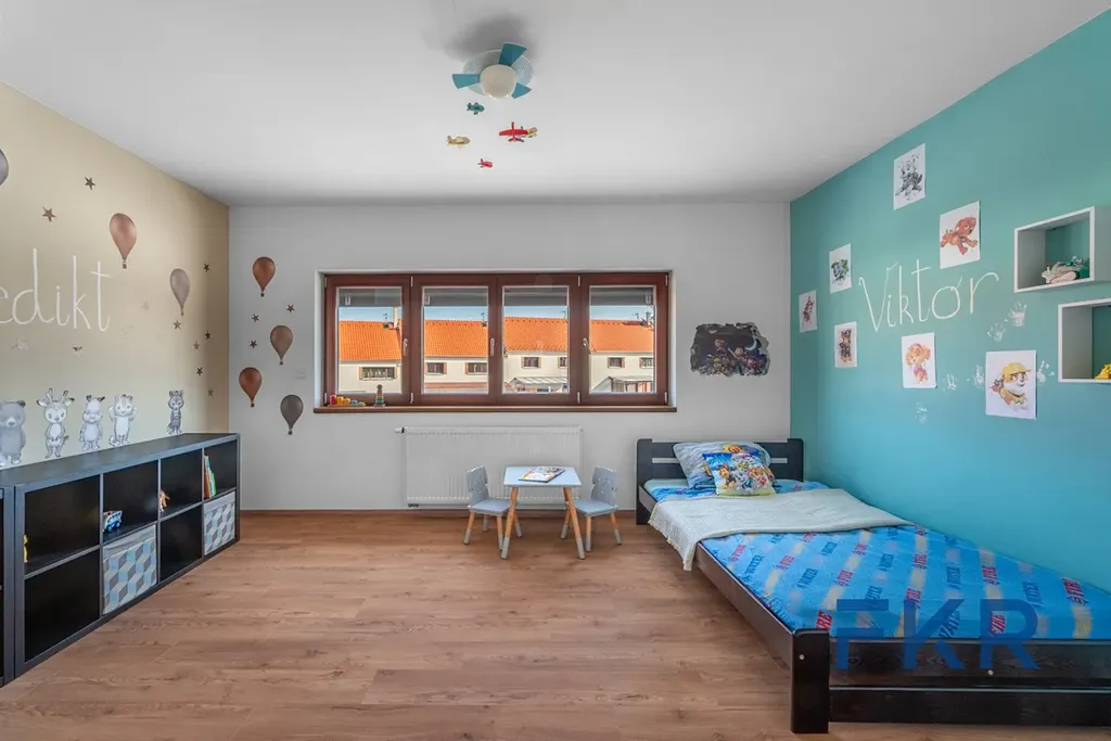 Horní podlaží tvoří klidovou část domu určenou pro odpočinek i soukromí. V patře se nacházejí tři samostatné pokoje, šatna, oddělená toaleta a velká koupelna. Přirozené denní světlo vytváří díky velkým oknům a vhodné orientaci příjemnou atmosféru v každé místnosti. Předokenní stínění přispívá k vyššímu komfortu a pravidelné dispozice pokojů usnadňují jejich praktické uspořádání.