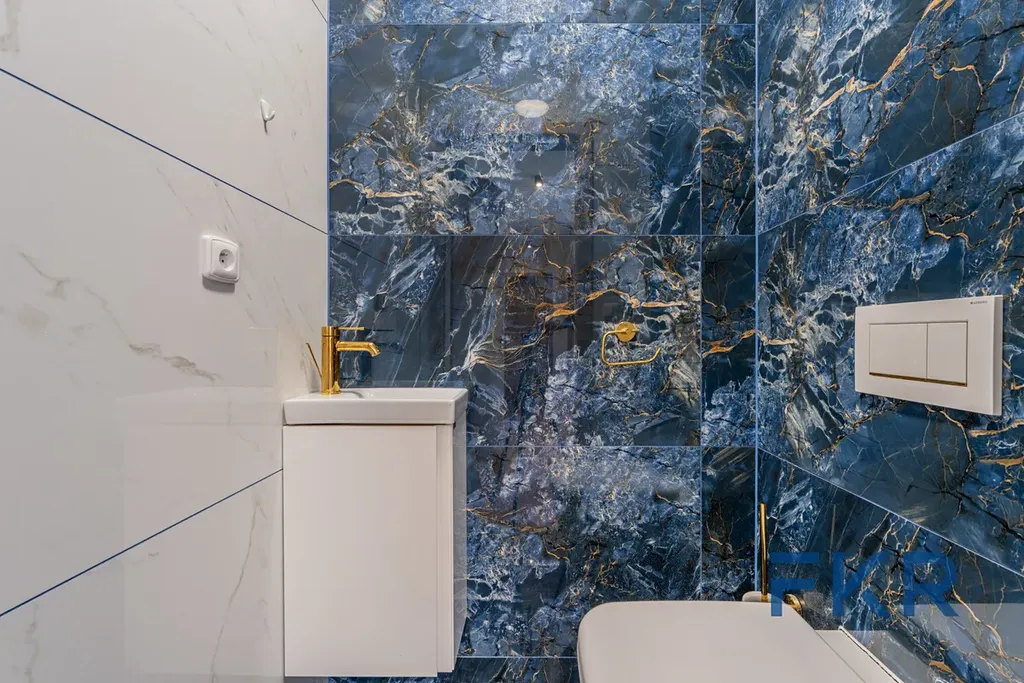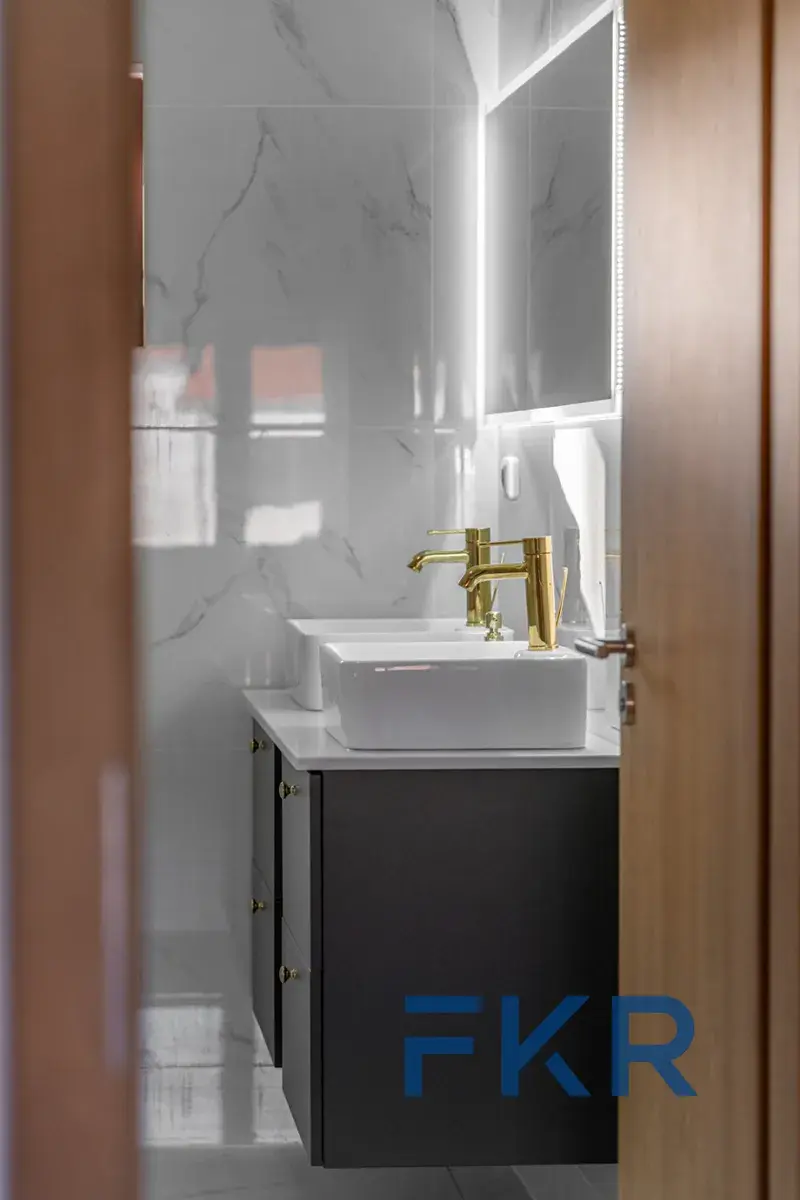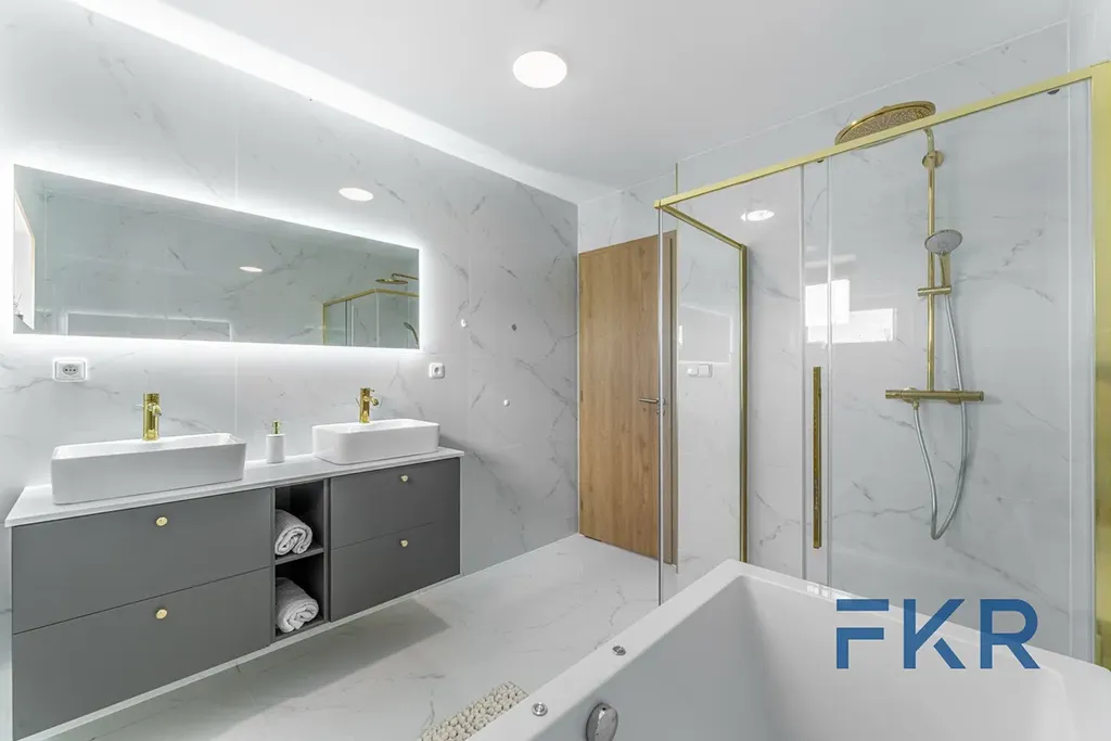 Obě koupelny jsou navrženy v jednotném, elegantním stylu s walk-in sprchou, v horním podlaží doplněnou o masážní vanu. Světlý obklad s jemným žilkováním spolu se zlatými armaturami Hansgrohe vytváří harmonický celek, který díky oknům podtrhuje i přirozené denní světlo.