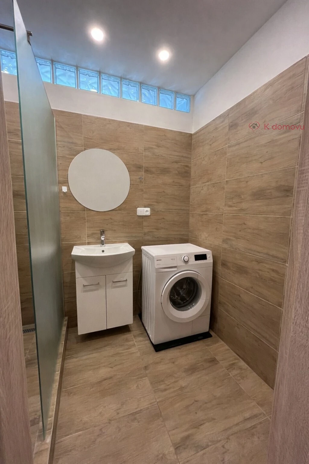 V koupelně je prostorný sprchový kout, umyvadlo a pračka.