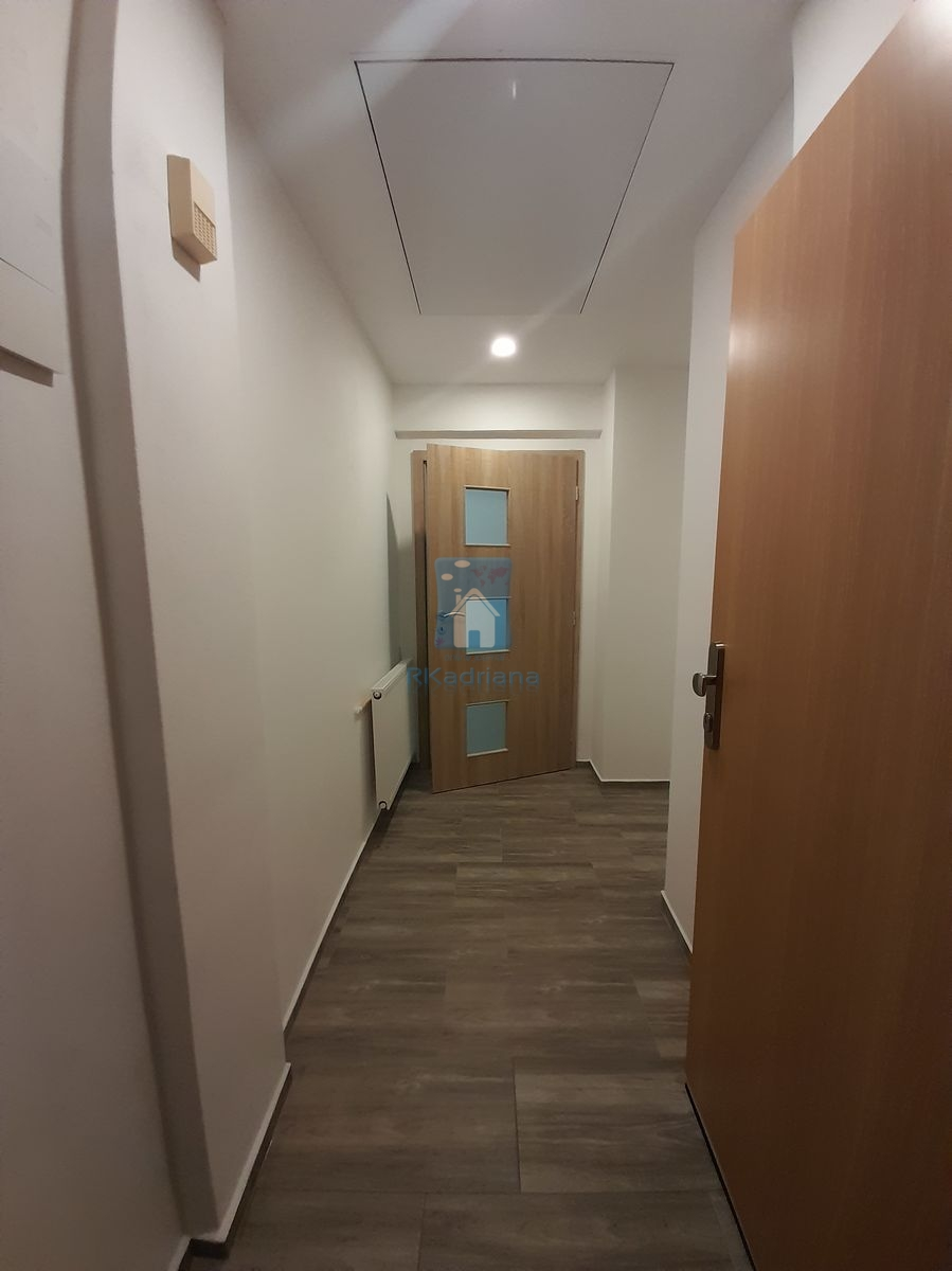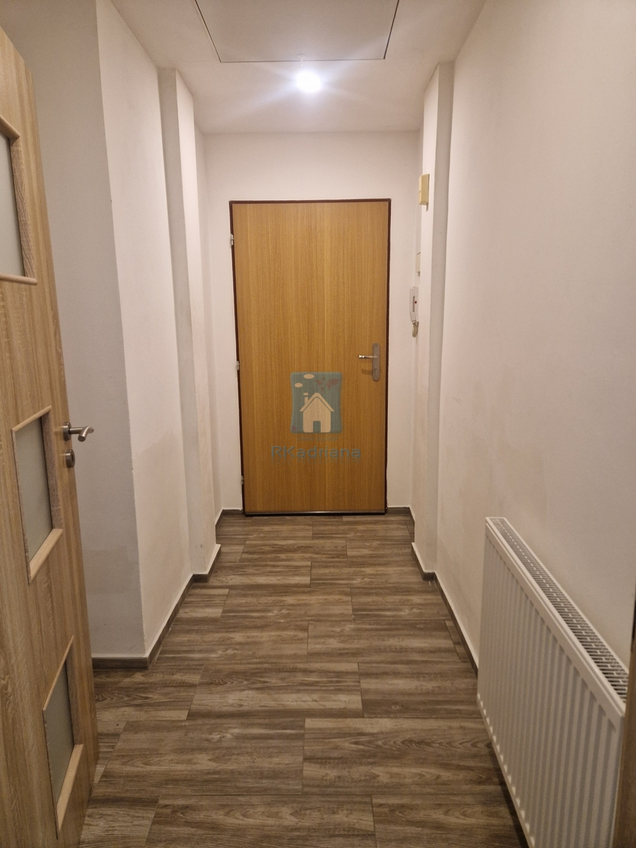 Při vstupu do bytu vejdete do prostorné předsíně, v níž je snížený strop a v něm vybudovaný úložný prostor. Kuchyňská část je vybavena novou moderní kuchyňskou linkou se sporákem, digestoří a lednicí s mrazákem. Koupelna je vybavena novým sprchovým koutem, umyvadlem, zrcadlem, pračkou, toaletou a je zde osazený i plynový kondenzační kotel, který zajišťuje úspornější vytápění a ohřev vody v bytě. Z koupelny je dále vstup na balkon, který náleží k bytu a je situován do vnitrobloku. Podlahová krytina koupelny a kuchyňské části je moderní a praktická dlažba.