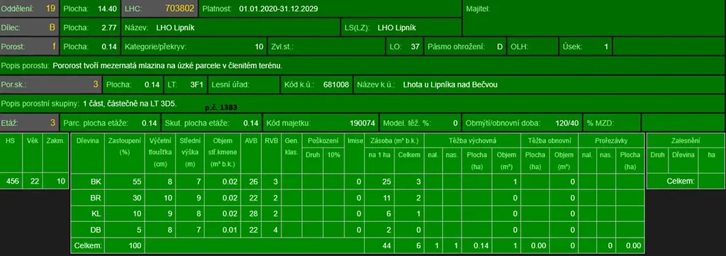 - p.č. 1383 vedená jako lesní pozemek o celkové výměře 1 562 m2 (stáří lesa 27 let - zastoupení dřevin buk, bříza, javor, dub).