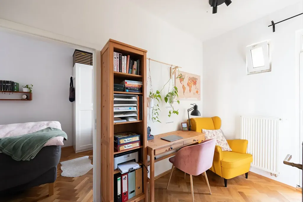 Další místností je pracovna o velikosti přibližně 7,5 m², která může sloužit jako home office, pokoj pro hosty nebo menší dětský pokoj. Z této místnosti je vstup na balkon orientovaný do vnitrobloku, který může sloužit například pro ranní kávu nebo krátký odpočinek.
