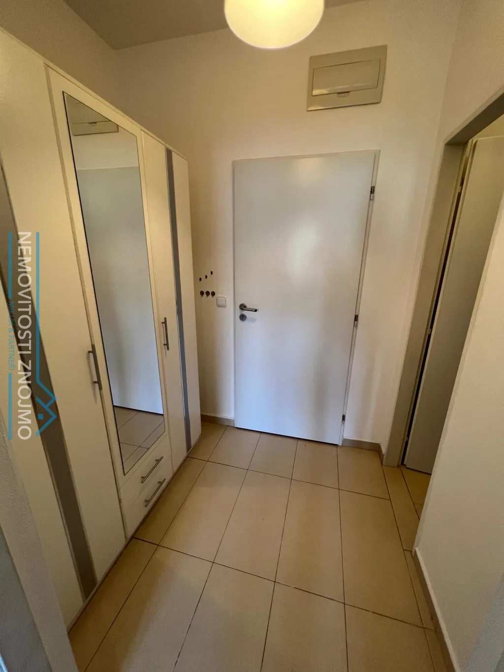 Byt sestává z předsíně, odkud se jde do koupelny se sprchovým koutem a toaletou a dále do obývací místnosti s kuchyňskou linkou a spotřebiči, a odsud do ložnice.