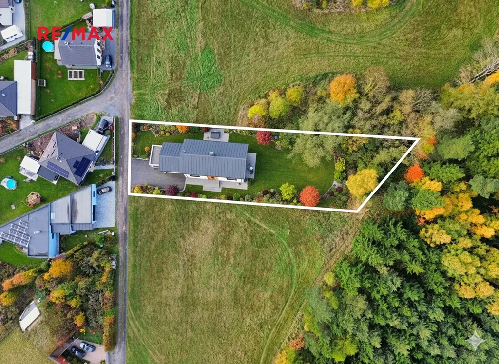 Pozemek sousedí přímo s lesem, což zajišťuje nádherný výhled do zeleně a okamžitý přístup do přírody. Vedle se rozprostírá pole, ideální na procházky nebo venčení psů.
