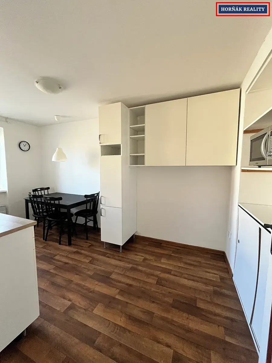 Dispozice bytu: vstupní chodba se šatní skříní, koupelna s vanou, samostatné WC, pokoj se skříní, obývací pokoj a kuchyně, která je vybavena myčkou, mikrovlnkou a jídelním stolem.
