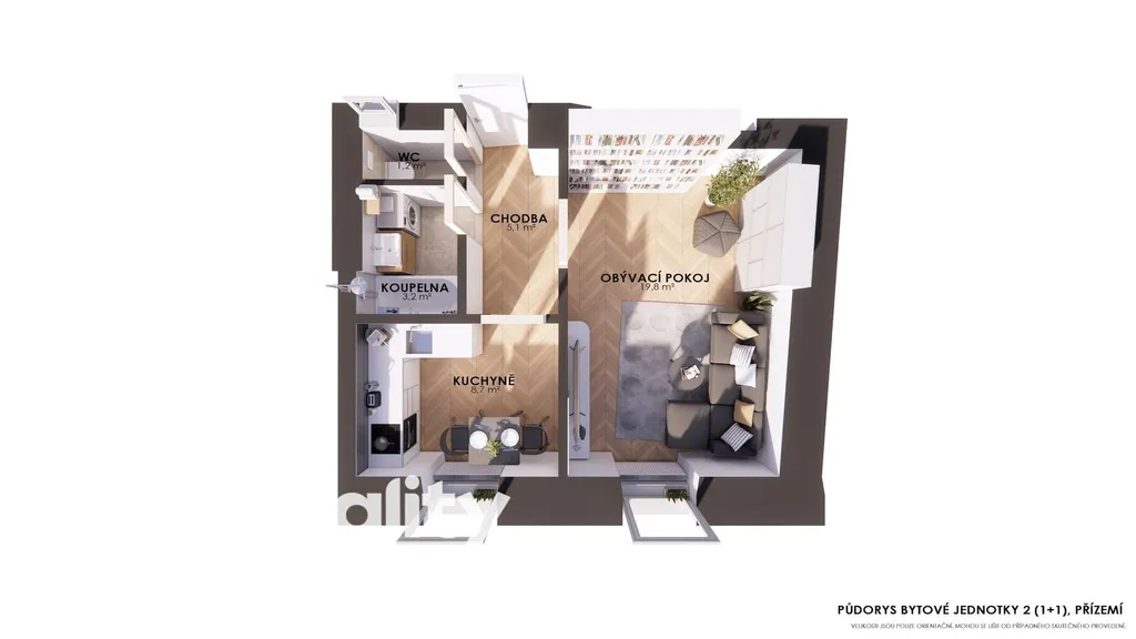 Součástí bytu je také předzahrádka o velikosti 33 m², která poskytuje příjemný prostor k odpočinku, posezení nebo menšímu zahradničení.