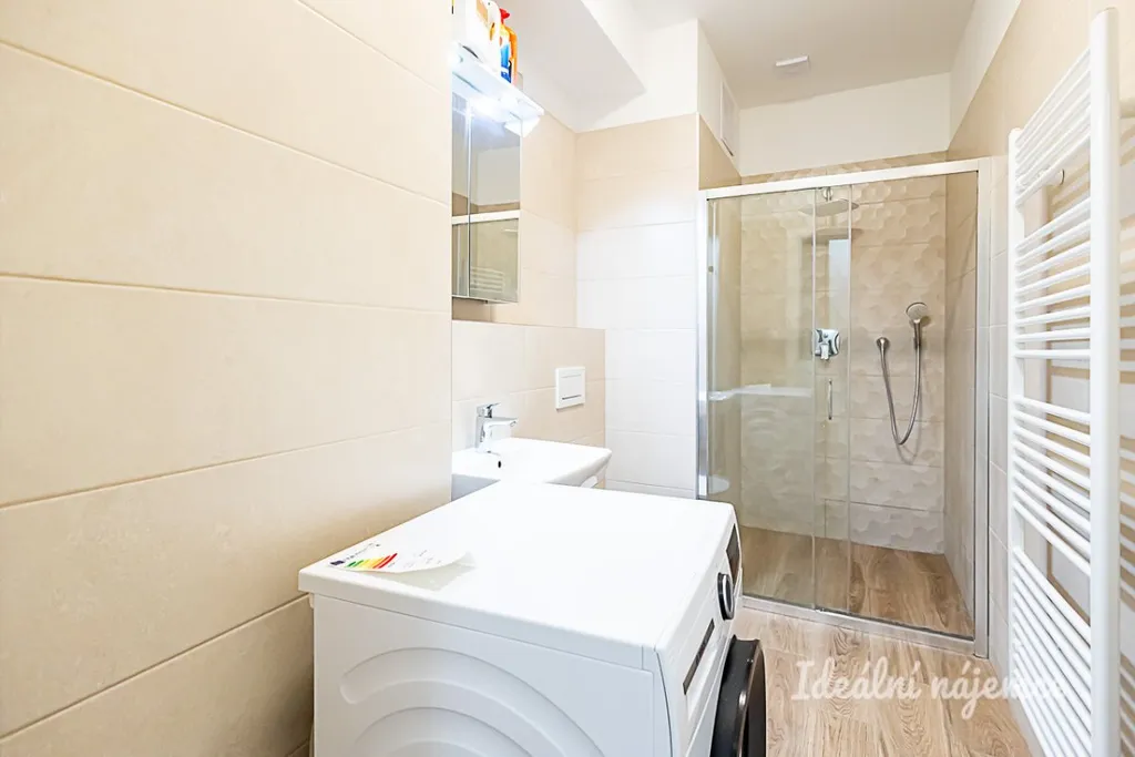 Interiér bytu je navržen tak, aby poskytoval dostatek prostoru i komfortu. Kuchyňská linka je plně připravena k vaření – je vybavena lednicí s mrazákem, elektrickou i mikrovlnnou troubou, varnou deskou, digestoří a myčkou, která vám ušetří čas. Obytná část bytu je velmi světlá a otevřená, což vám dává skvělou příležitost dotvořit si prostor vlastním nábytkem a doplňky přesně podle vašeho vkusu. Koupelna nabízí čistý a funkční design se sprchovým koutem, umyvadlem, toaletou a je vybavena pračkou.