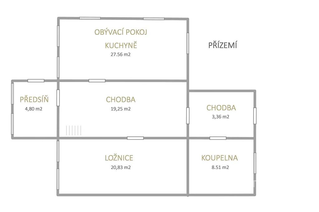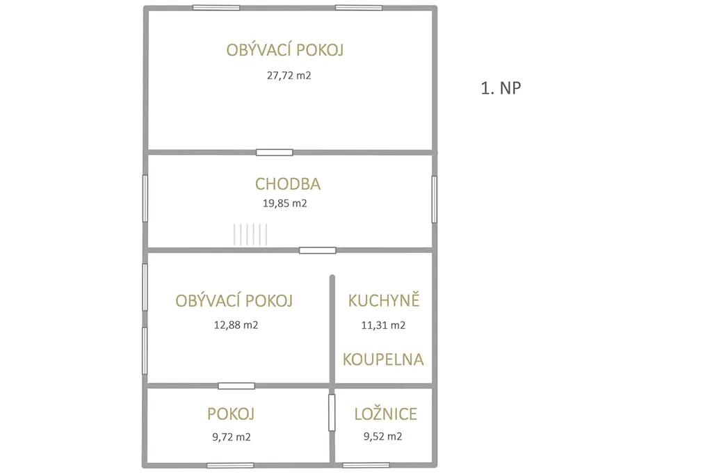 1. podlaží: Hlavní obytná část, kuchyně, koupelna a zázemí