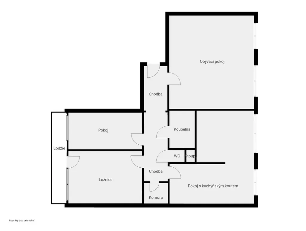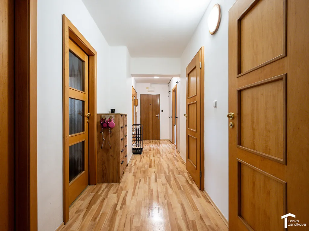 Bytová jednotka je umístěná ve 3. NP a po vstupu do bytu vás zaujme svojí dispozicí. Z prostorné chodby jsou vpravo dva samostatné pokoje, které se v tuto chvíli využívají jako pracovna a ložnice. Na ložnici navazuje prostorná zasklená lodžie o výměře 6m². Z chodby vlevo vejdete do světlého obývacího pokoje, který vás uchvátí svoji velkorysou výměrou 30m² . Zděná koupelna je oddělená od WC a je osazena jak vanou, tak sprchovým koutem. WC je samostatné. Další vstup je do pokoje, na který navazuje kuchyňský kout. V chodbě je k dispozici komora, která nabízí úložný prostor.