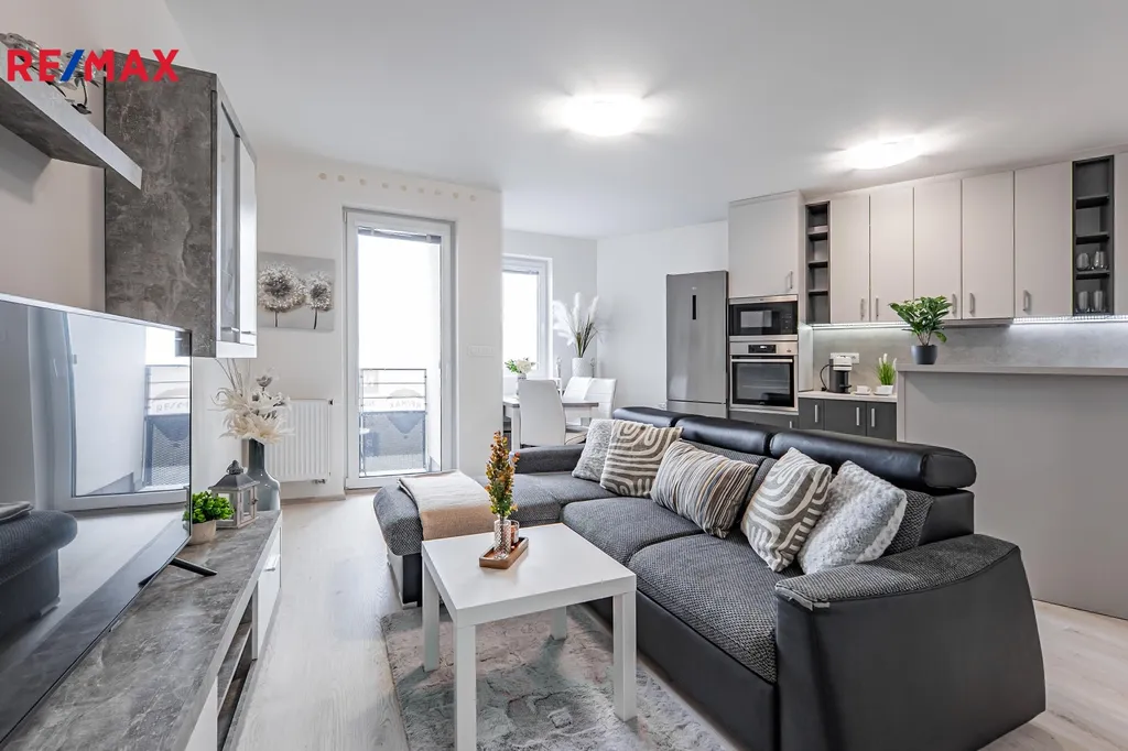 Interiér je připraven k okamžitému nastěhování bez dalších investic. V obývací části je pohodlný gauč, televizor (2 ks) a jídelní stůl. Ložnicová zóna nabízí manželskou postel a praktické úložné prvky. Kuchyňská linka s kvalitními spotřebiči AEG (trouba, varná deska, digestoř, myčka, lednice) je doplněna o kávovar, topinkovač a mixér značky MICAN. Koupelna je vybavena sprchovým koutem a pračkou se sušičkou. V předsíni potěší velká vestavěná skříň a botník, v bytě je dále menší komora a příjemná lodžie pro ranní kávu či večerní posezení.