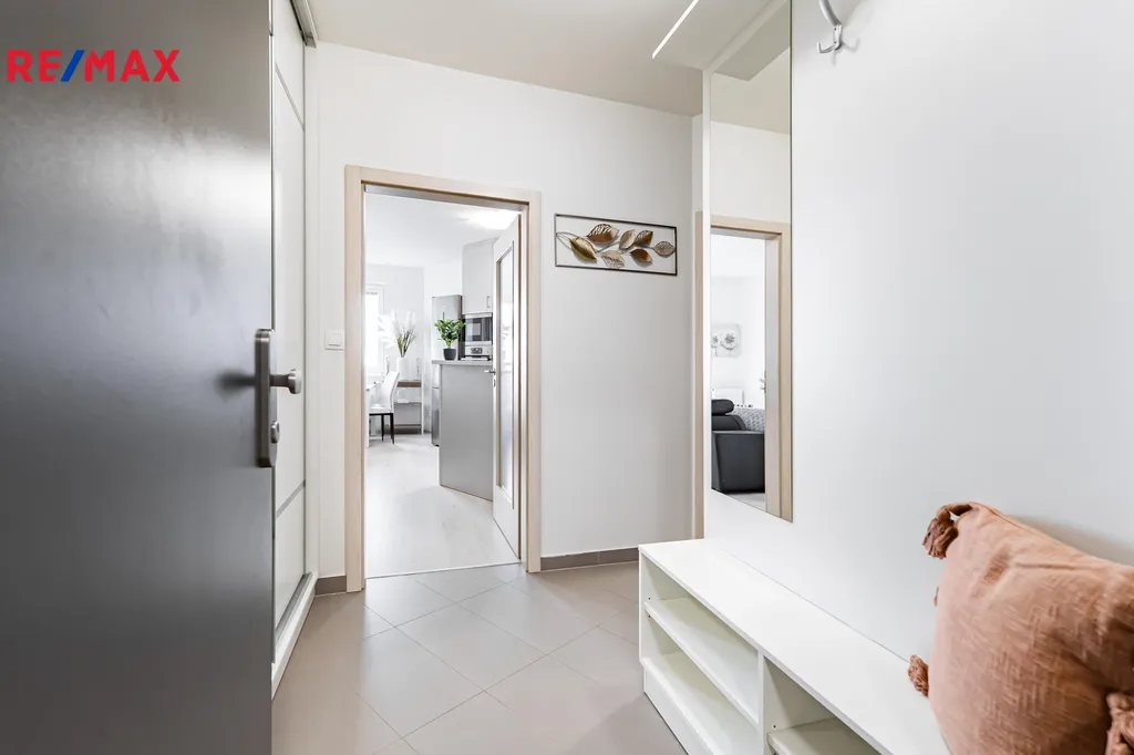 Interiér je připraven k okamžitému nastěhování bez dalších investic. V obývací části je pohodlný gauč, televizor (2 ks) a jídelní stůl. Ložnicová zóna nabízí manželskou postel a praktické úložné prvky. Kuchyňská linka s kvalitními spotřebiči AEG (trouba, varná deska, digestoř, myčka, lednice) je doplněna o kávovar, topinkovač a mixér značky MICAN. Koupelna je vybavena sprchovým koutem a pračkou se sušičkou. V předsíni potěší velká vestavěná skříň a botník, v bytě je dále menší komora a příjemná lodžie pro ranní kávu či večerní posezení.