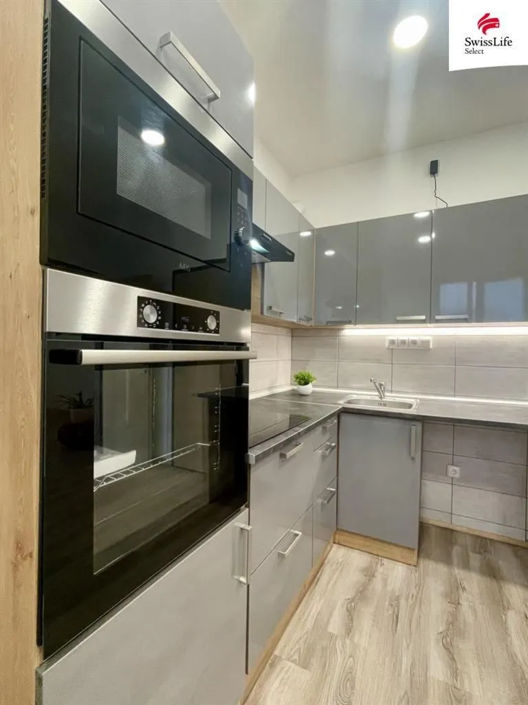 Vstoupíte ze společné chodby rovnou do světlé a elegantní kuchyně, kde najdete šedou kuchyňskou linku s vestavnými spotřebiči. Je tady zároveň dostatek místa pro jídelní stůl. Odsud je vstup do druhé místnosti se zajímavým tvarem, který může pomoci zařídit byt trochu netradičně. Dvě velká okna vedou do vnitřní zahrady, což prostoru dává hodně světla a vzdušnosti.