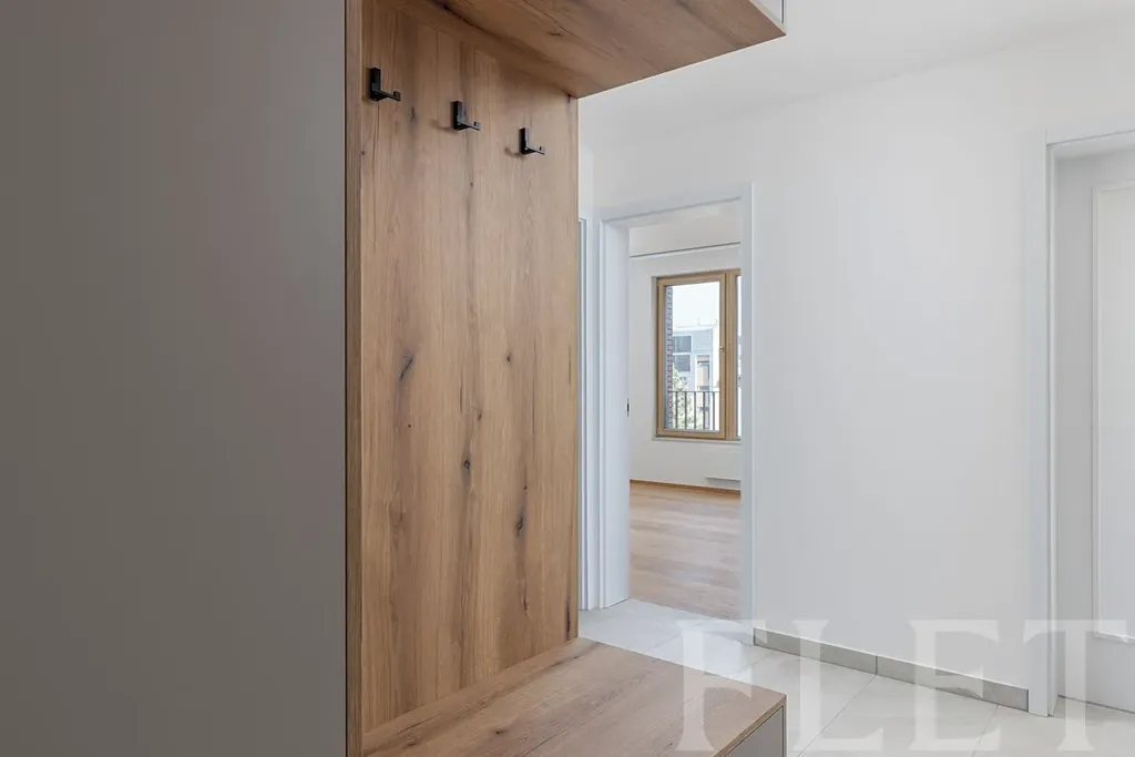 Dominantou bytu je prostorný obývací pokoj s kuchyňským koutem, který tvoří přirozené centrum celého bytu. Kuchyňská linka je vybavena moderními spotřebiči – indukční varnou deskou, troubou, digestoří s ventilací, myčkou a lednicí s mrazákem. Součástí bytu je také pračka a komfort bydlení doplňuje elektrické odvětrávání. Ložnice nabízí dostatek prostoru pro pohodlné spaní i úložné řešení a v předsíni se nachází praktická vestavěná skříň.