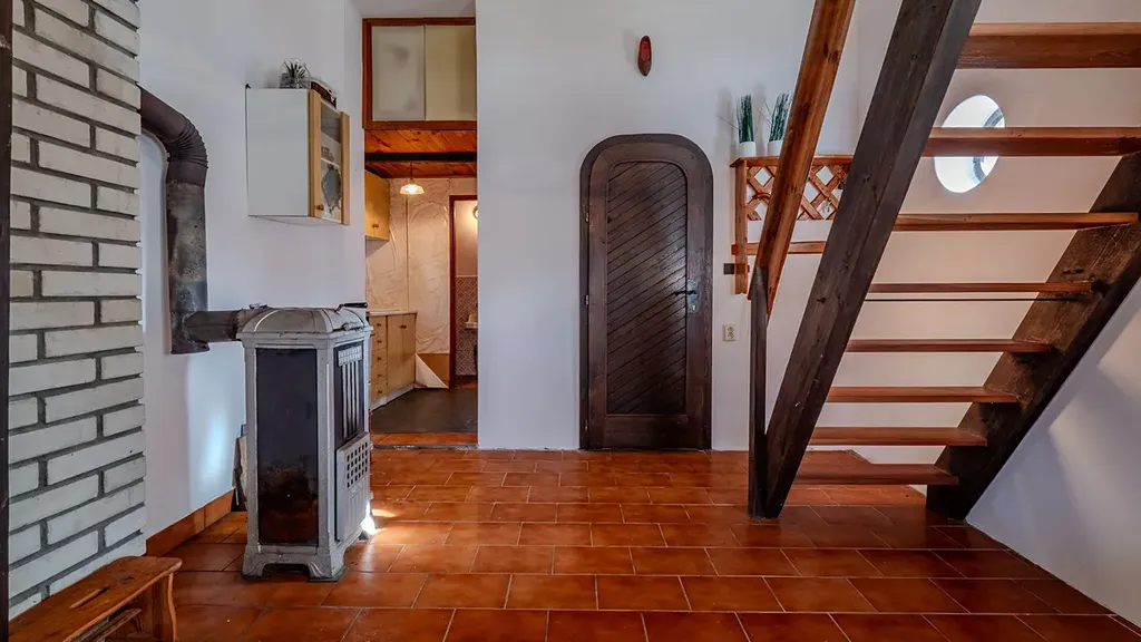 Vstupem přes prosklenou verandu se dostaneme do obytné místnosti, kde je vestavěné patro se vstupem na jižně orientovaný balkón, ideální místo pro probuzení s výhledem do zeleně. Dále je zde kuchyňský kout se sporákem a spižírna. Vytápění je zde řešeno kamny na dřevo a voda je z vlastní studny. Chata je připojena k elektrické síti.