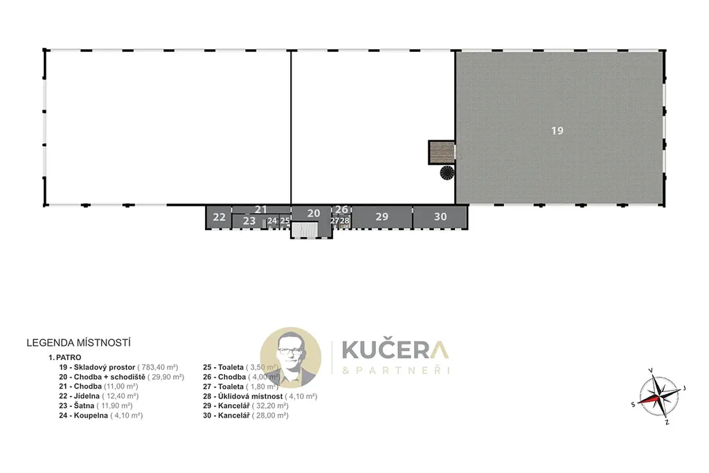 - užitná plocha: hala a sklady 3 100 m² + kanceláře a zázemí 400 m² (celkem 3 457 m²)