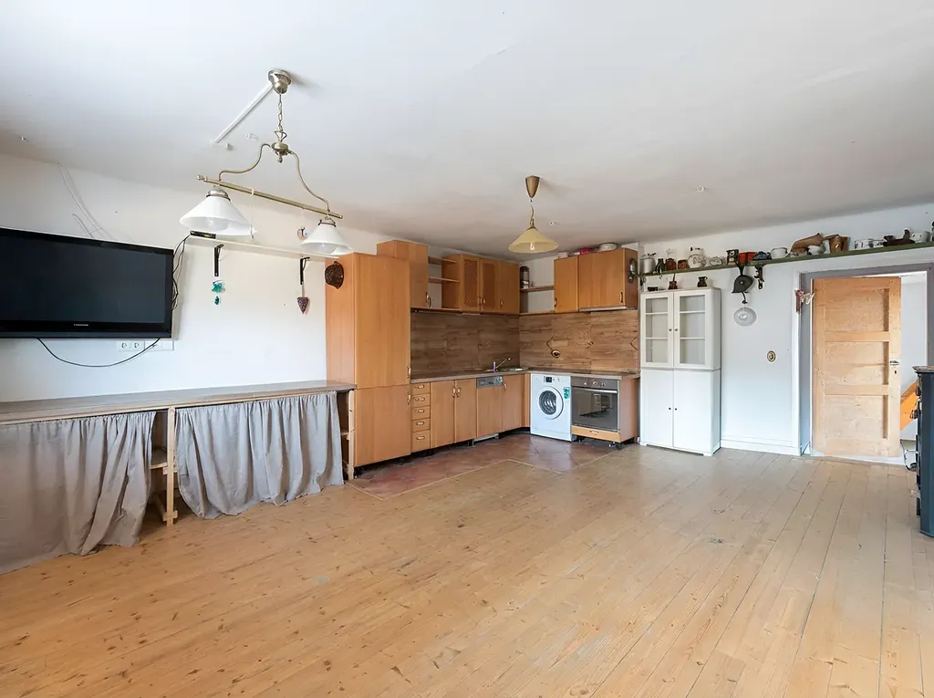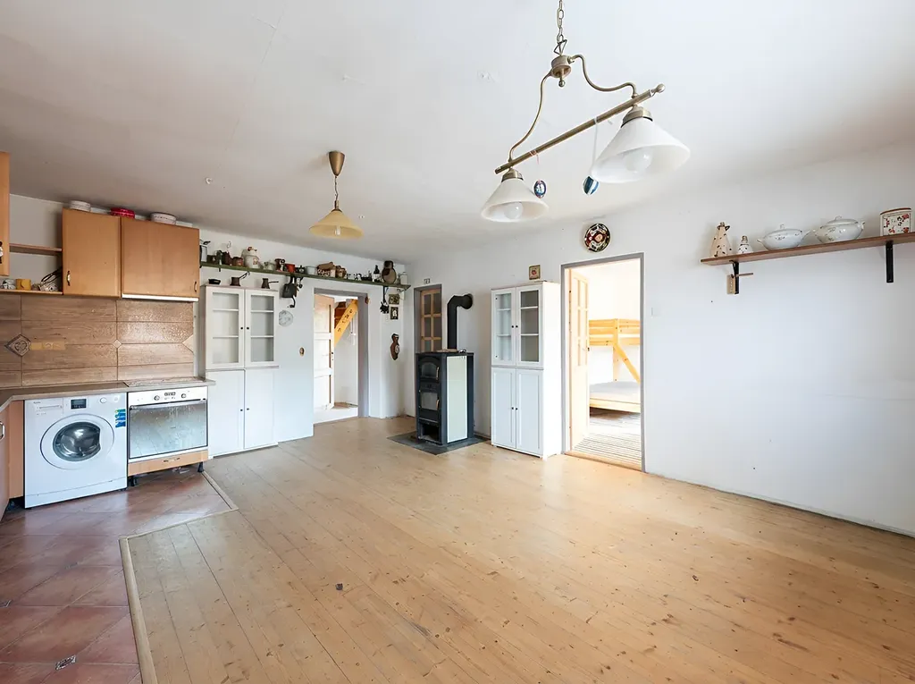 Zadní třetina domu v přízemí je ponechána před rekonstrukcí, což dává novému majiteli jedinečnou možnost přizpůsobit si dispozici přesně na míru svým potřebám.