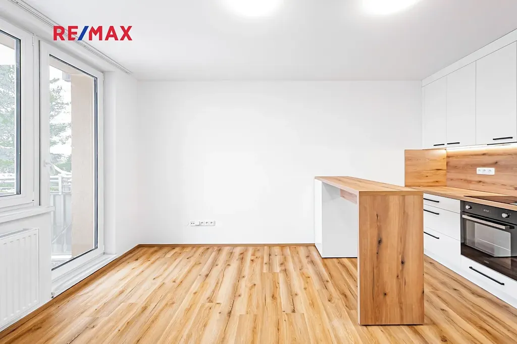 Kuchyně je vybavena nejmodernějšími spotřebiči, které vám usnadní každodenní život. Najdete zde novou myčku, lednici s mrazákem, troubu a varnou indukční desku. Spolu s tím je k dispozici posuvný barový stůl, abyste mohli maximálně využít prostor v druhé části místnosti, kterou představuje obývací pokoj, ze kterého se mj. dostanete na prostorný balkon o výměře cca 3,43 m². Spolu s tím bylo myšleno na Váš maximální komfort. Z toho důvodu byly v chodbě vedle koupelny instalovány pračka a sušička spolu s vestavěným uloženým prostorem např. na ručníky aj.
