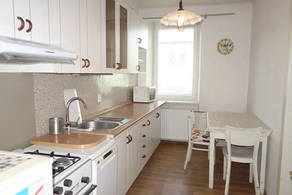 Byt je vybaven kuchyňskou linkou, plynovým sporákem s digestoří, myčkou, ledničkou a mikrovlnnou troubou. Vytápění je ústřední plynovým kotlem a ohřev vody zajišťuje elektrický bojler. V bytě je zaveden internet. Po dohodě s pronajímatelem lze stávající nábytek vyklidit.