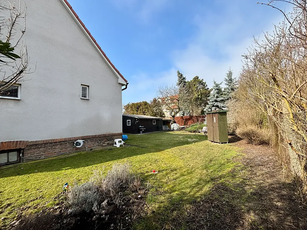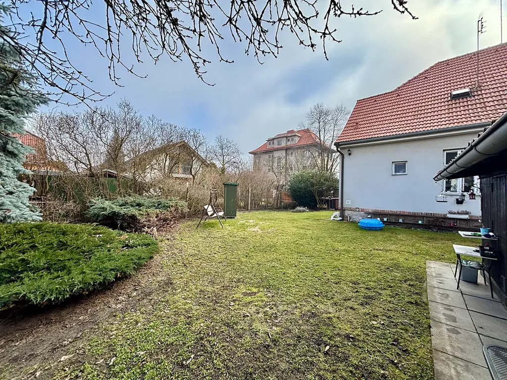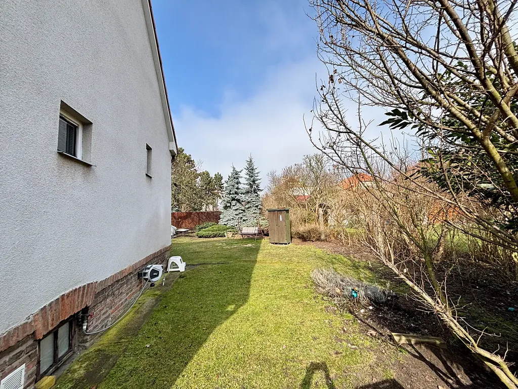 Celková plocha pozemku činí 374m2. Zahrada je orientovaná na severo-západ – ideální pro odpolední odpočinek. Na pozemku stojí praktická kůlna. Dům bude k dispozici po uhrazení kupní ceny, dle dohody.