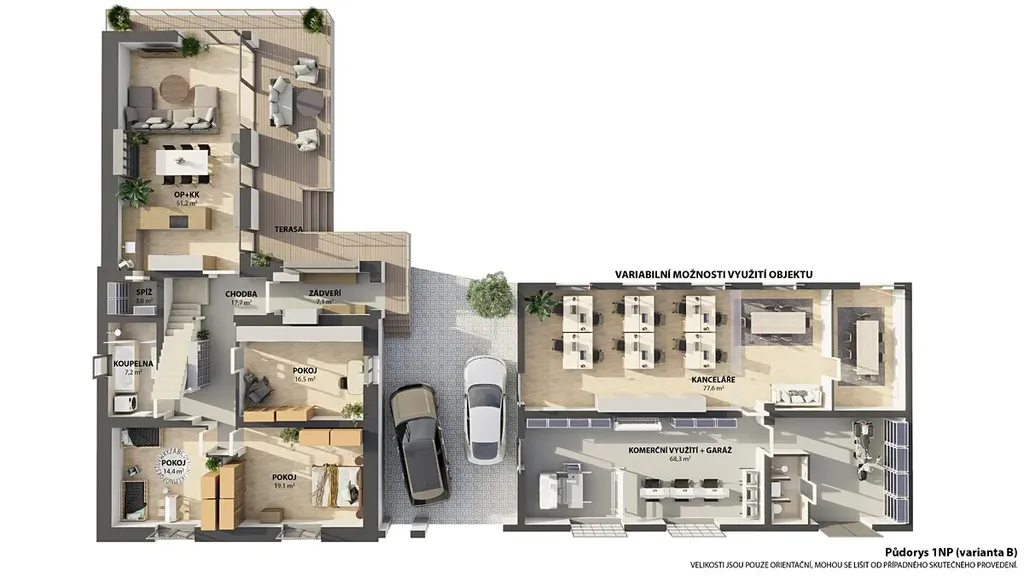 Hlavní budova (užitná plocha 301 m2) + prostorná terasa: Velkoryse koncipovaný prostor vhodný jak pro komfortní bydlení, tak pro administrativní zázemí firmy s obytnou částí. Dispozičně je řešena jako 7+1 se 2 koupelnami.