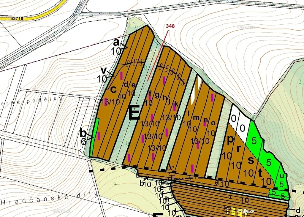 Lesní pozemek o výměře 6 360 m2, parcelní číslo 348, podíl 1/1, katastrální území Hradčany na Moravě, obec Hradčany, obec s rozšířenou působností Přerov, okres Přerov, Olomoucký kraj. Po těžbě.