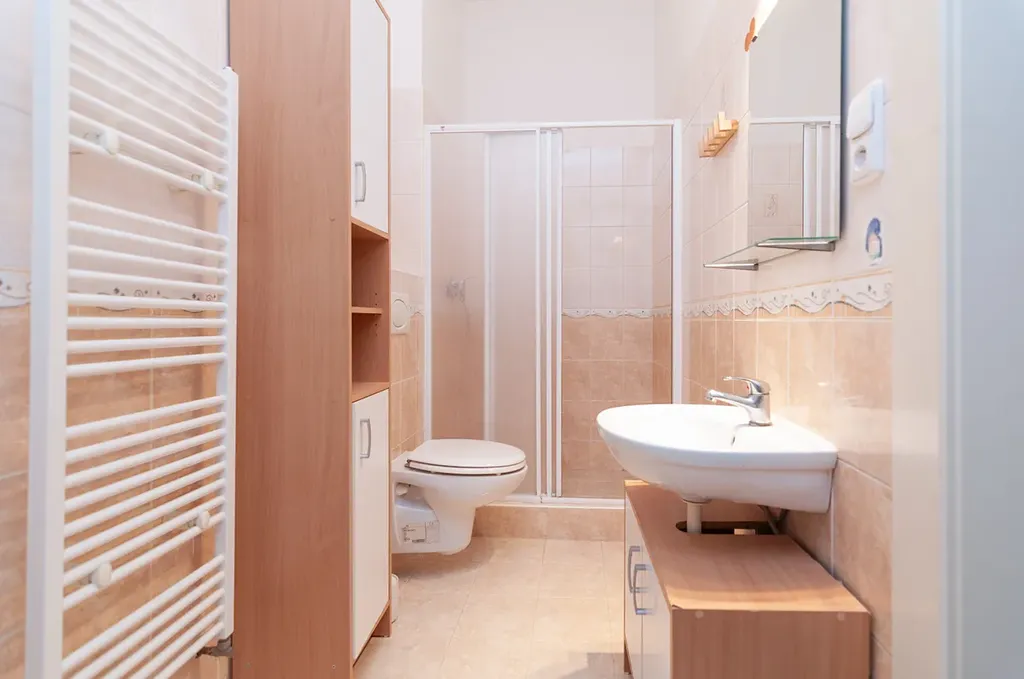 K dispozici je koupelna s prostorným sprchovým koutem, bojlerem pro ohřev vody, toaleta a pračka. Pokoje jsou orientovány na jihovýchod, s výhledem na rodinné domy. Lešení bude asi během měsíce odstraněno.