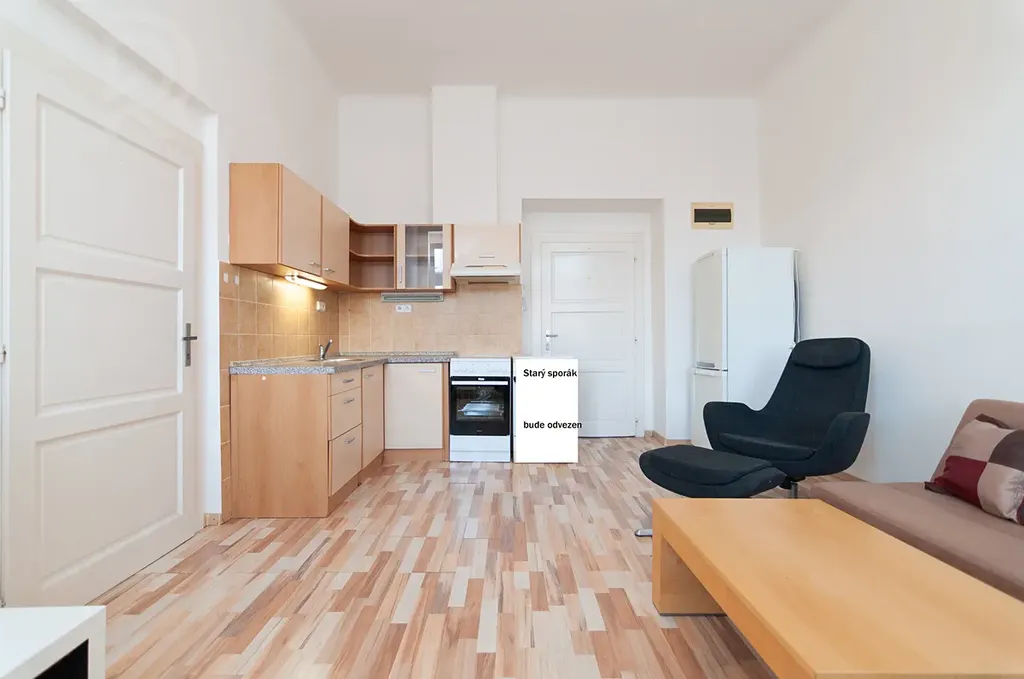 Byt disponuje prostorným obývacím pokojem spojeným s kuchyní, přes který projdete do ložnice a dále do koupelny. Kuchyň je vybavena kuchyňskou linkou, elektrickou troubou, odsavač par, samostatně stojící lednicí.