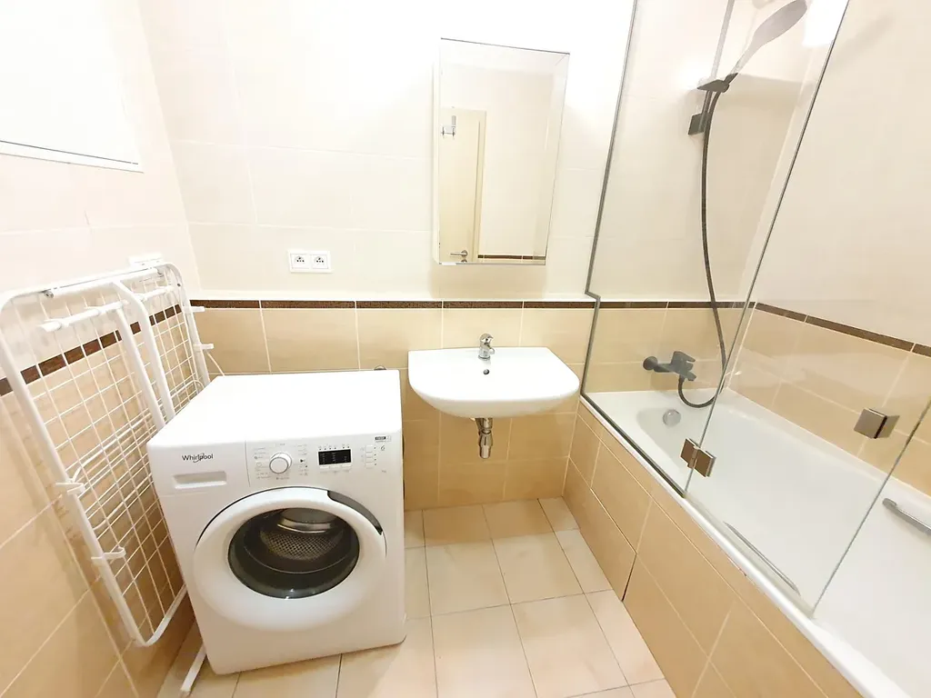 Pokoj s vybavenou kuchyňskou linkou, vestavěná šatní skříň v předsíni, koupelna s vanou a toaletou, žaluzie.